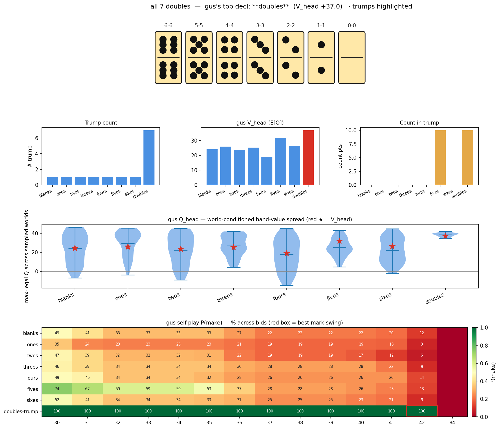 Hand tiles with trumps highlighted, plus trump count / V_head / count-in-trump bars, Q-spread violin, and the P(make) heatmap.