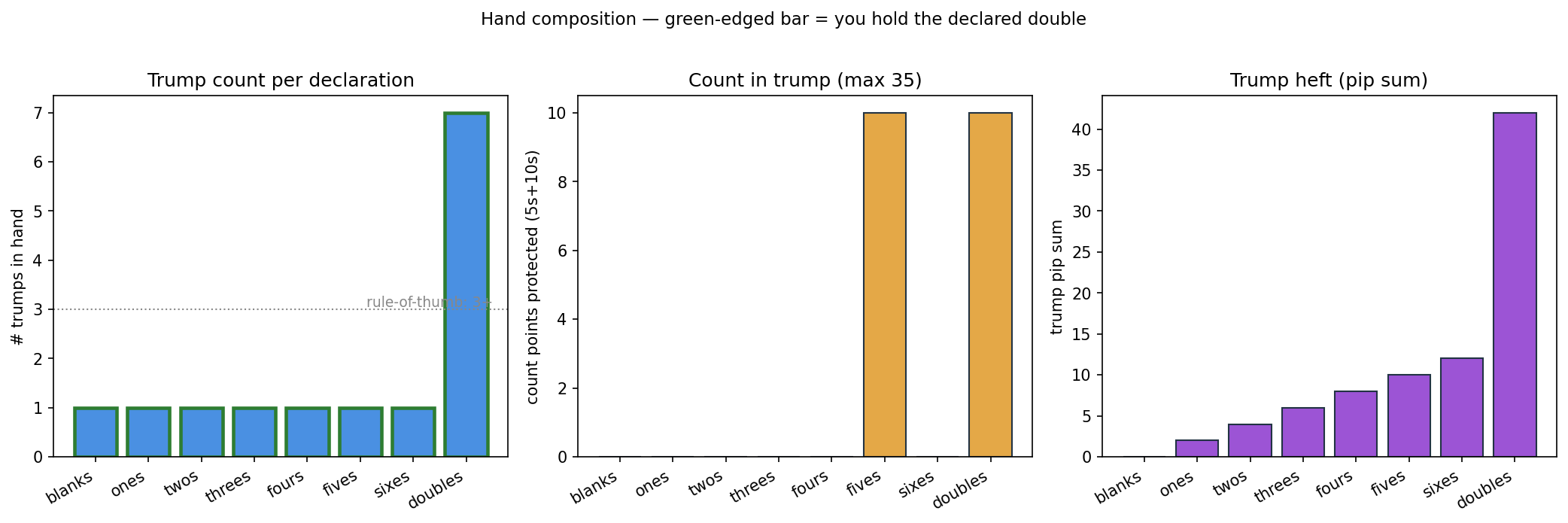 Trump count, count-point protection, and pip-sum "heft" per declaration. Green-edged = you hold the declared double.