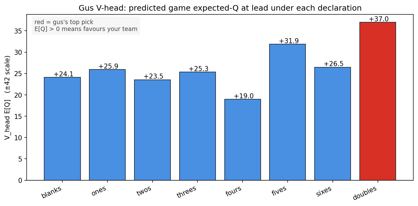 Gus's expected game E[Q] on ±42 scale, assuming oracle partner. Red bar = top pick.