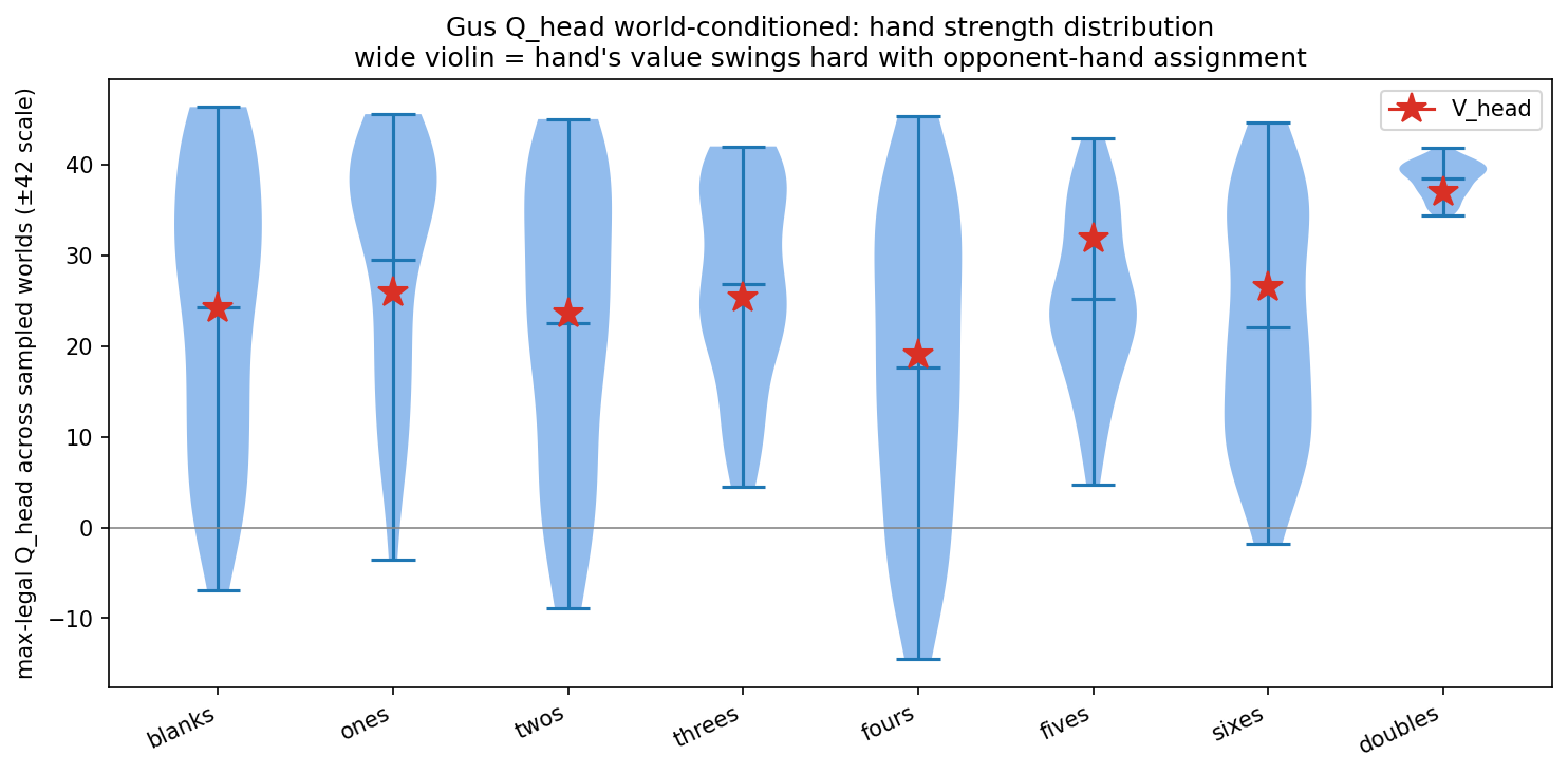 Max-legal Q across 64 sampled opponent-hand worlds. Wide = hand swings with the deal.