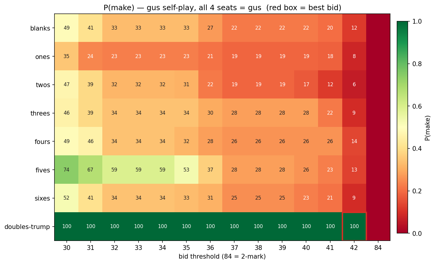 All 4 seats = gus. 100 random deals per declaration. Red-box = best expected mark swing.