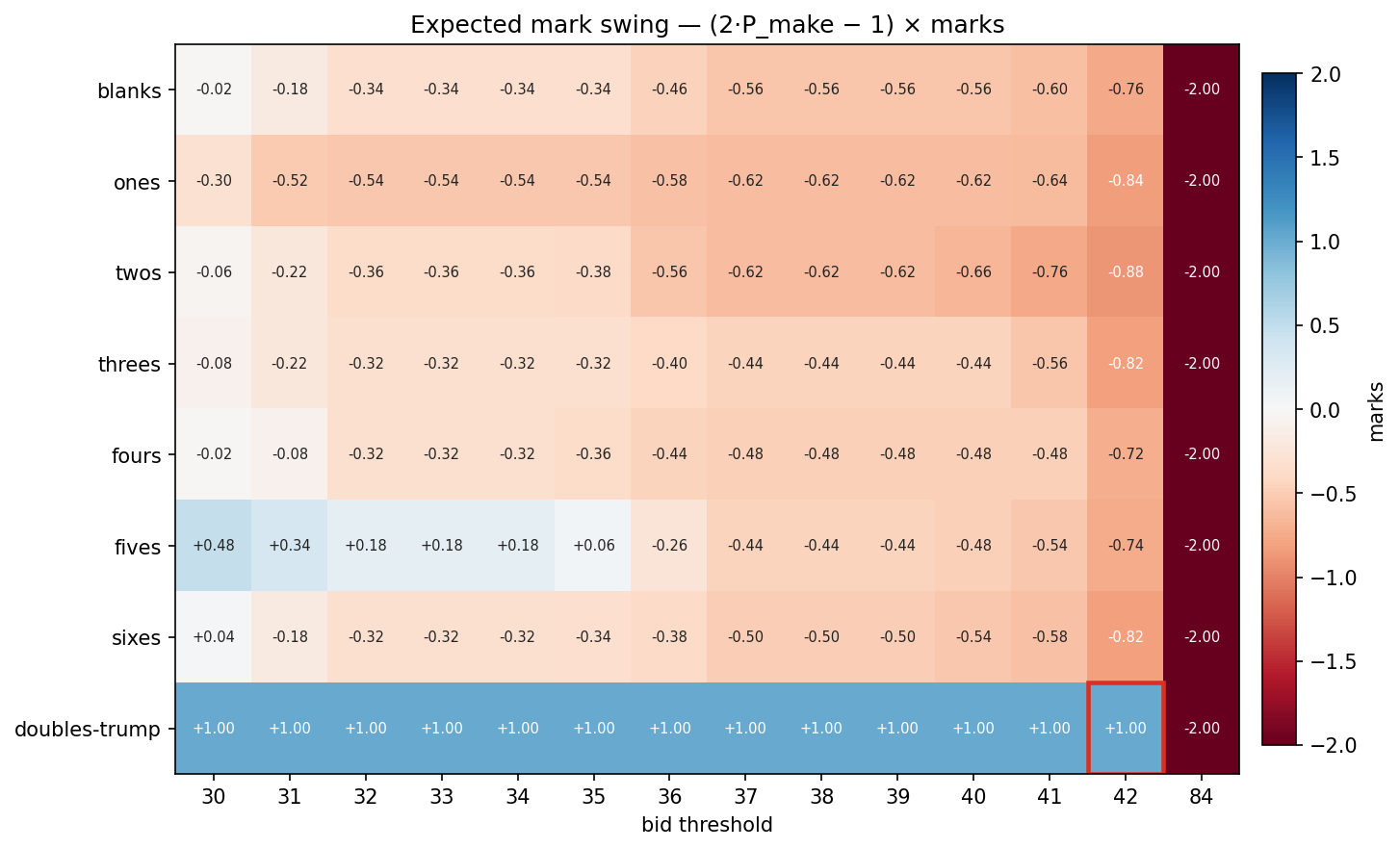 (2·P_make − 1) × marks. Positive = bid it, negative = pass.